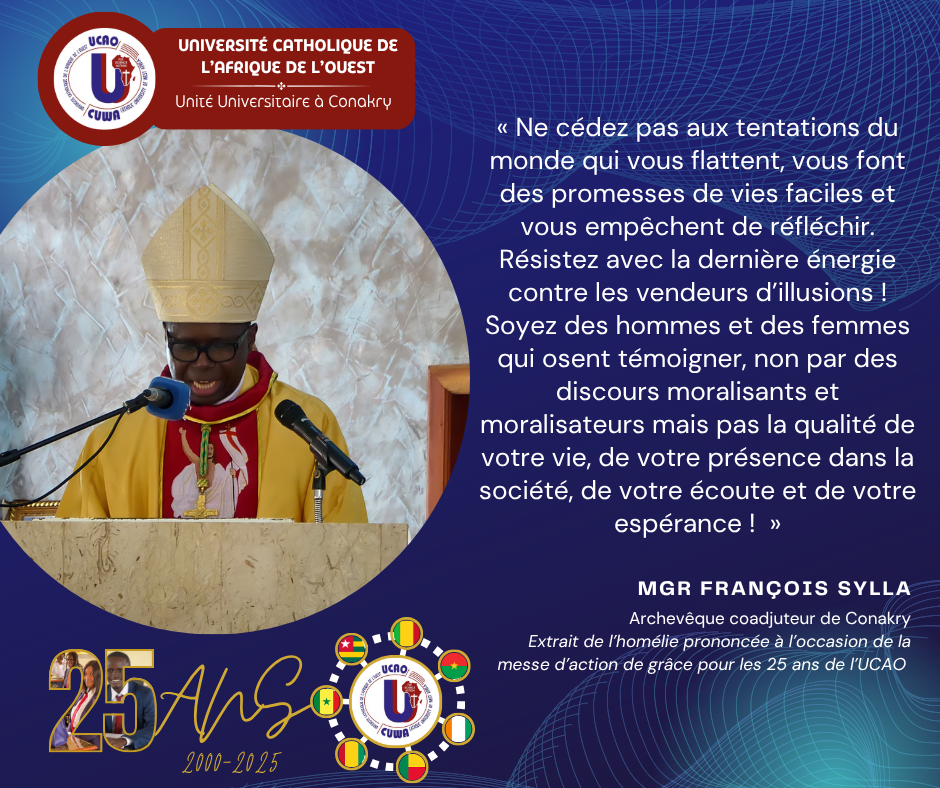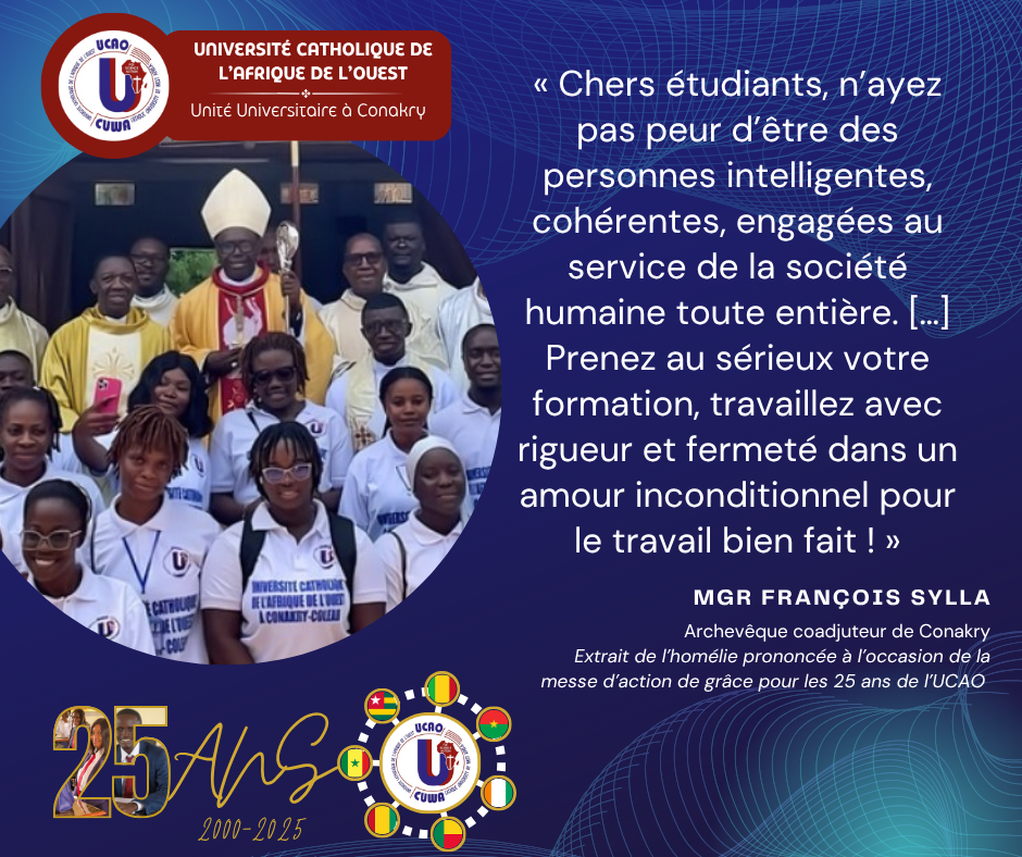 Fondée en février 2000, par la Conférence Episcopale Régionale de l’Afrique de l’Ouest (CERAO) à Conakry, l’Université Catholique de l’Afrique de l’Ouest (UCAO) est une Université de Droit Pontifical à l’échelle des pays de la CERAO.